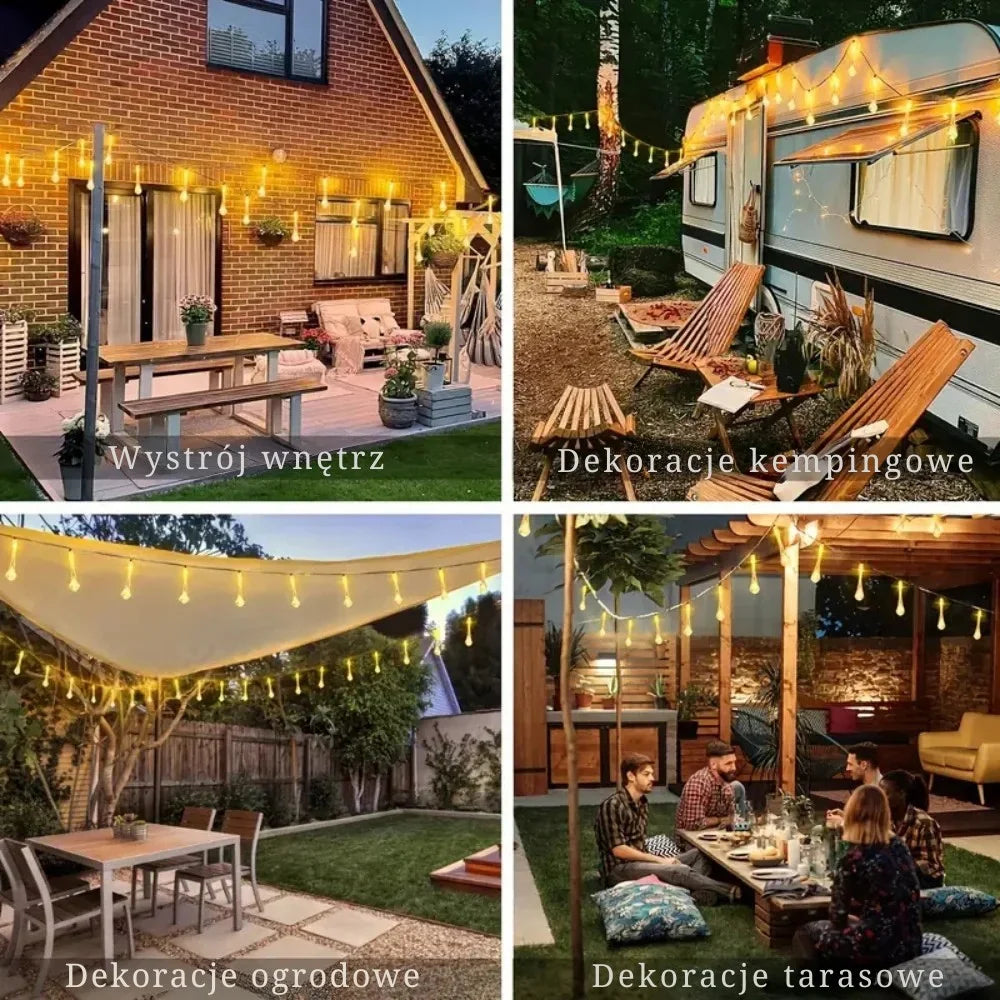 Dzięki wodoodporności IP65 i solidnym materiałom lampki świecą pięknie podczas przyjęć, świąt i przez wszystkie pory roku.