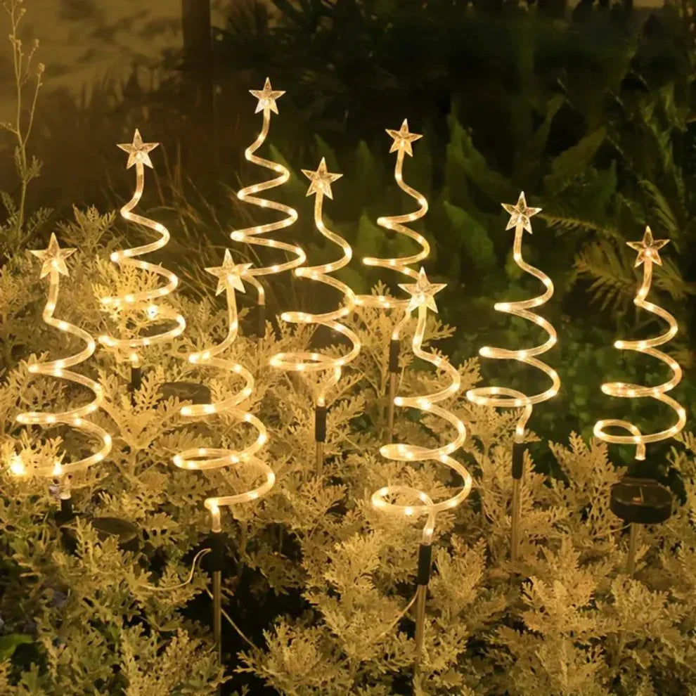 Lampki mają świąteczne wzory gwiazdy i choinki.