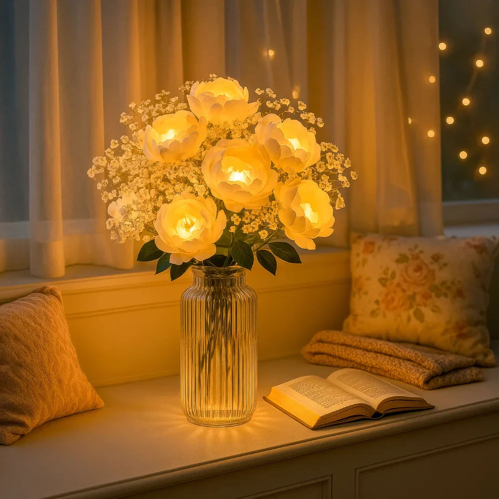 Veloria Rozkwitająca Lampa z Piwoniami wnosi ciepło i elegancję do Twojego domu, a jej delikatne światło naśladuje kojące barwy zachodzącego słońca.