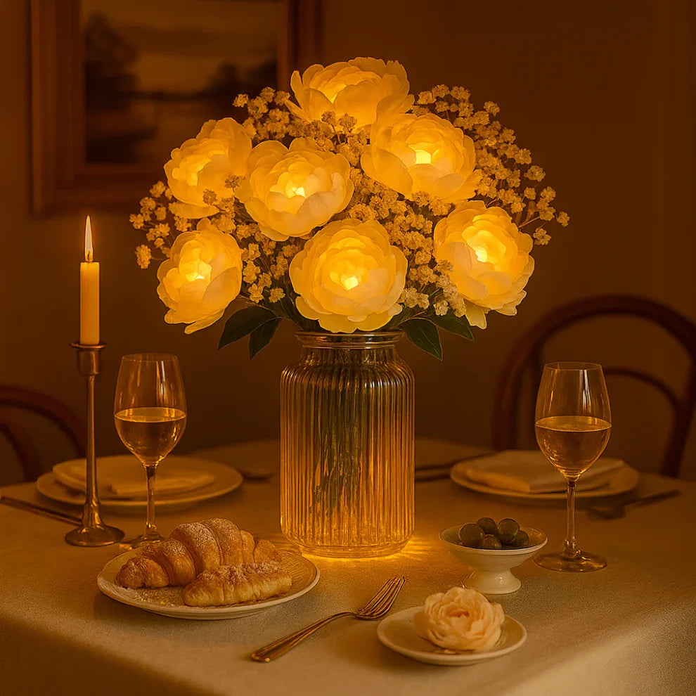 Dzięki subtelnym płatkom i miękkiemu, złocistemu blaskowi te piwonie są zarówno trwałe, jak i pełne wdzięku, oferując piękno o każdej porze dnia i nocy.